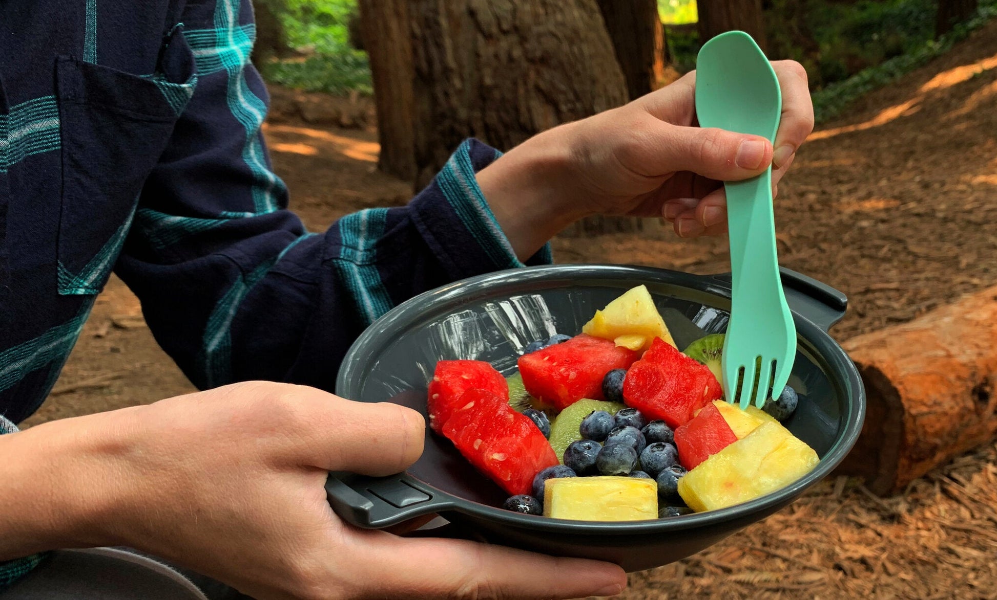 The GoKit plate and bowl feature a simple yet secure integrated locking mechanism. Other mess kits make you fiddle around with flimsy, rubber straps that break or get lost. Life’s too short and we’re hungry people! With GoKit, you just unclick the two halves so you’re eating in no time. Holes in the plate handles make it a cinch to attach a carabiner and hang a GoKit on the outside of your bag.